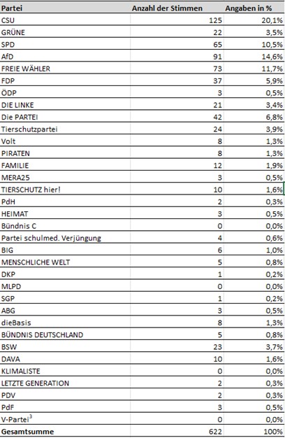 Bei der Auszählung der Stimmen konnte die CSU mit 20,1 % die meisten Stimmen erzielen, gefolgt von der AfD mit 14,6 % der Stimmen und der FREIEN WÄHLER mit 11,7 %.